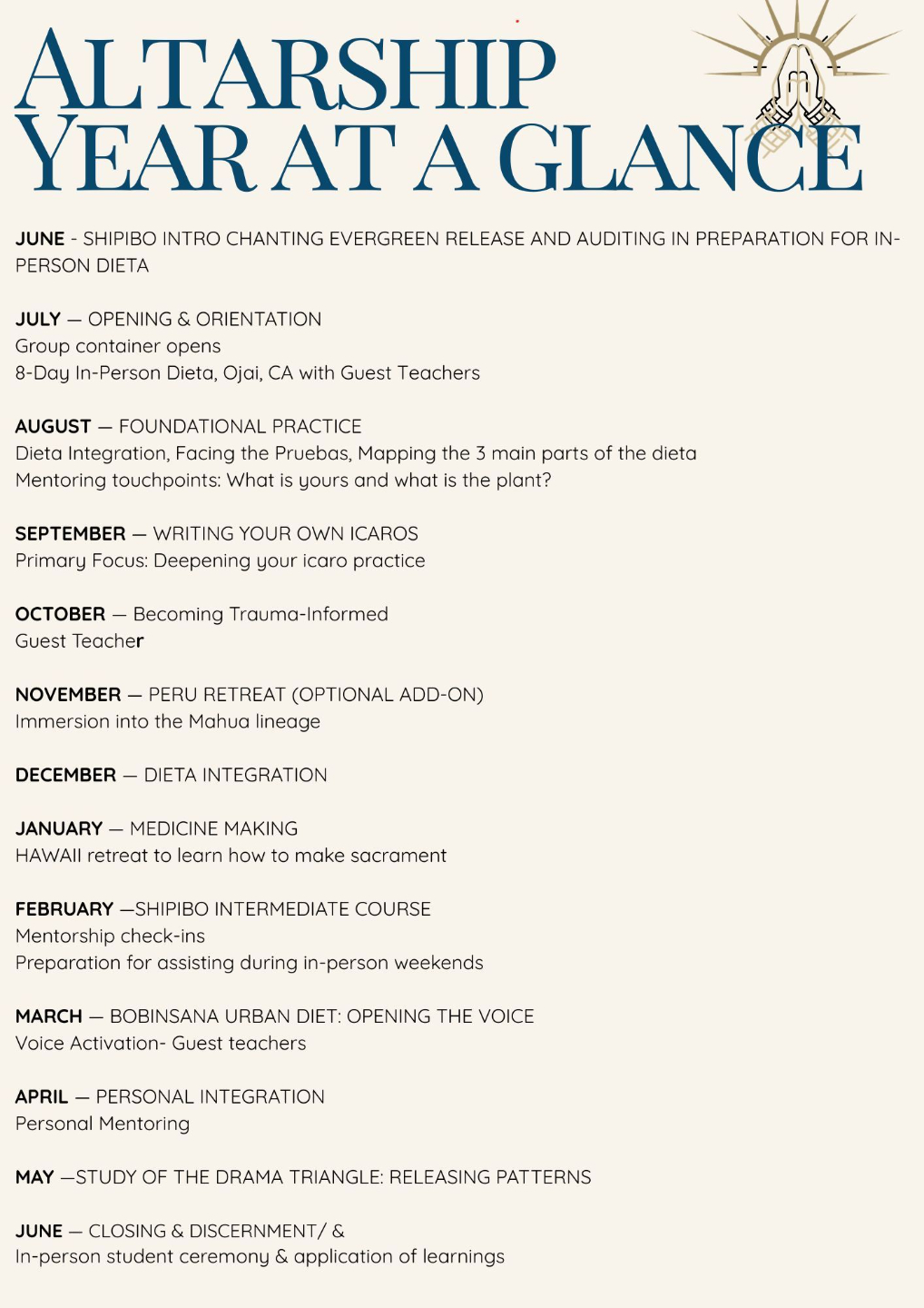 The foundational year of Sacred Altarship unfolds from July 2026 through June 2027. It includes: